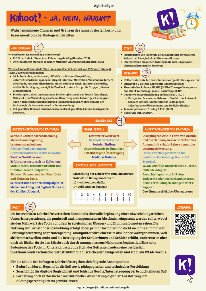Ergebnisse: Die Ergebnisse zeigen eine grundsätzlich positive Haltung gegenüber dem Einsatz von Kahoot! im Biologieunterricht. Das Tool wird insbesondere als motivierend, lernförderlich und geeignet für formative Lernstandsrückmeldungen wahrgenommen. Akzeptanzfördernd wirken schnelle Feedbackmöglichkeiten, bereits vorhandene Materialien, kollegialer Austausch sowie eine stabile technische Infrastruktur. Als akzeptanzhemmende Faktoren werden unter anderem Disziplinprobleme durch Anonymität, hoher Erstellungsaufwand qualitativ hochwertiger Items, technische Störungen, fehlende Fortbildungen sowie digitale Ungleichheit benannt.